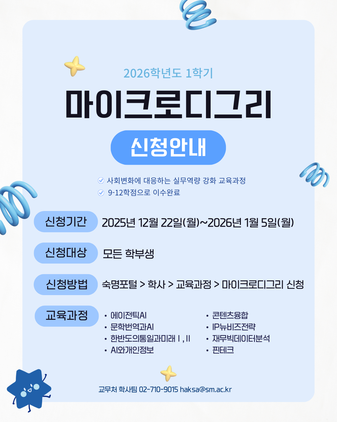26-1학기 마이크로디그리 신청 관련 안내문 올려드립니다.